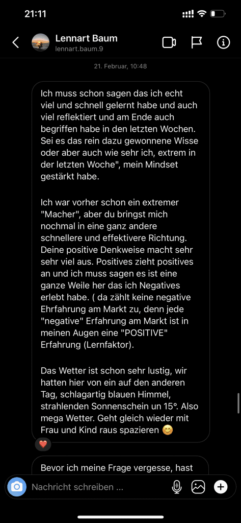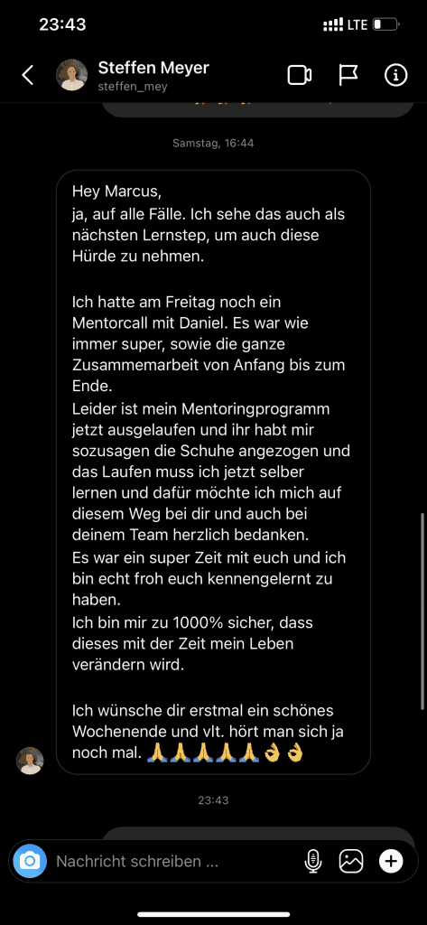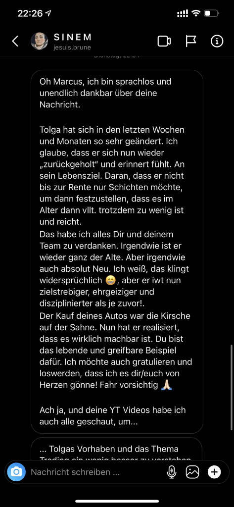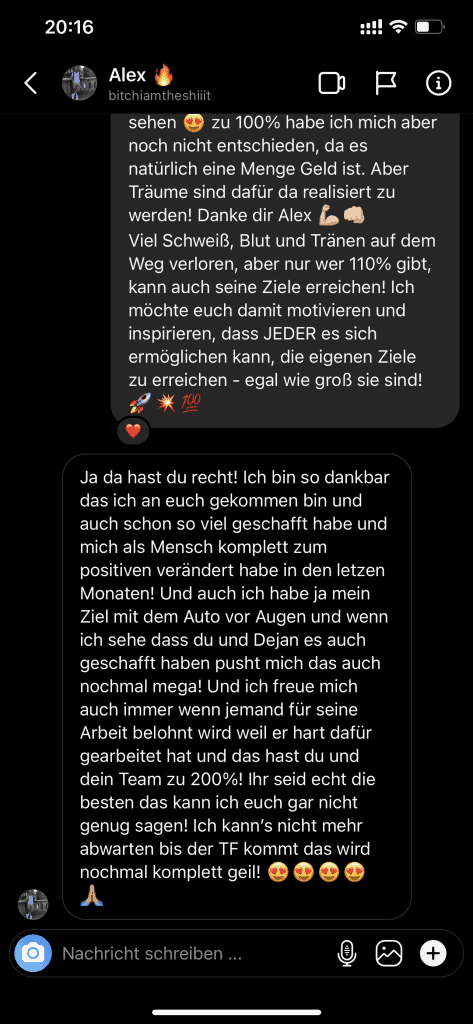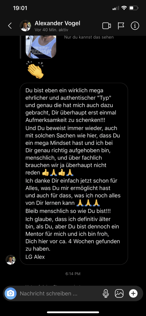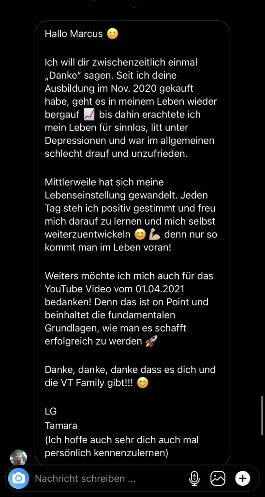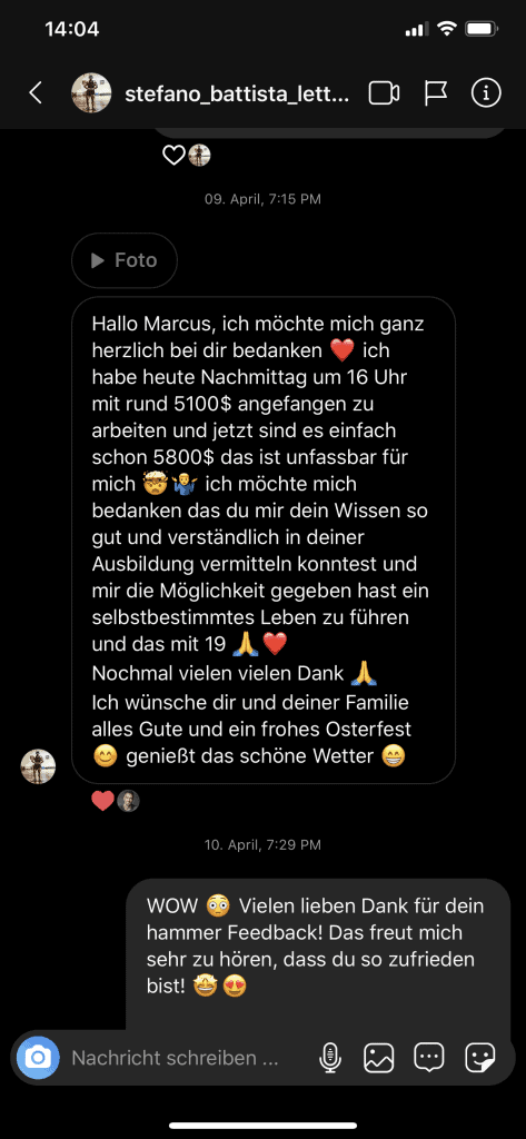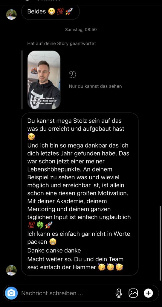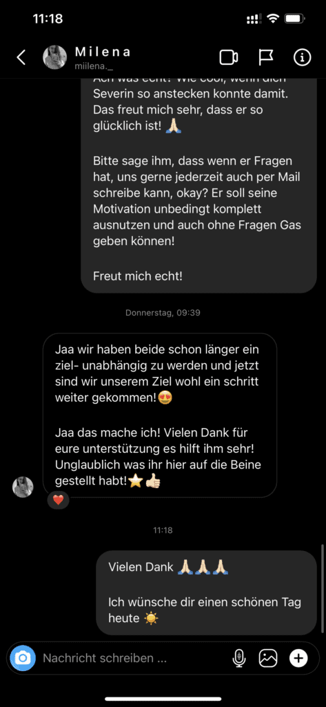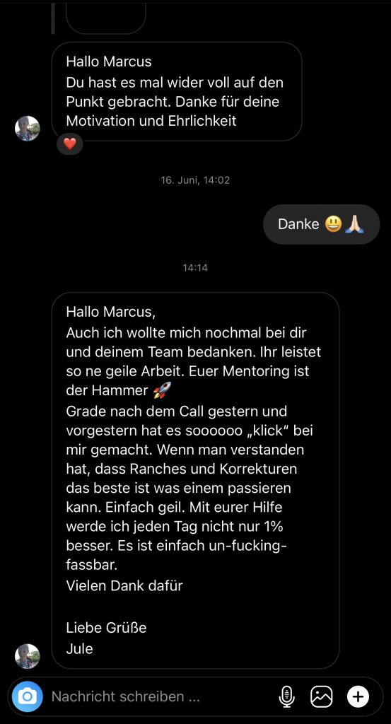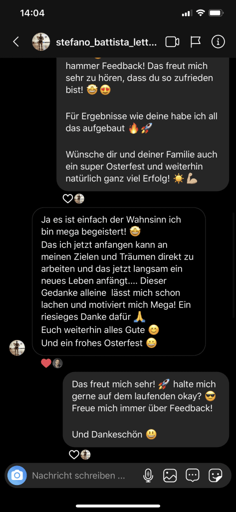 Wir wollen nicht nur zufriedene Kunden, sondern Kunden mit echten Resultaten. Feedbacks wie die, die du gleich lesen wirst machen uns jedes mal aufs neue stolz. Solche Momente bleiben in Erinnerung.