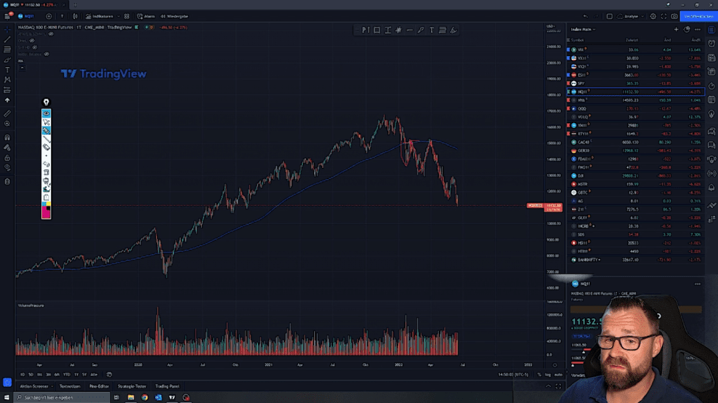 In unserem Beispiel betrachten wir einmal einen Tageschart des NASDAQ. Unser Coach Peter nutzt in diesem Fall die Software TradingView und lässt von dieser auch direkt einen Moving Average einzeichnen.